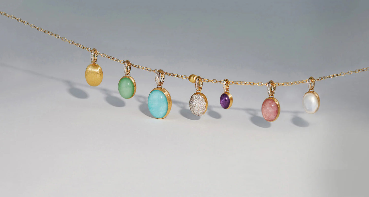 18Kゴールドにダイヤモンド、そして、ストロベリークォーツ、翡翠、アマゾナイト、レピドライトなどの天然石を使って、熟練職人が生み出したチャーム、ペンダント、Ciliegineイヤリング、リング。華やかな色彩とともに、あなただけのオリジナルのコンビネーションをお楽しみください。