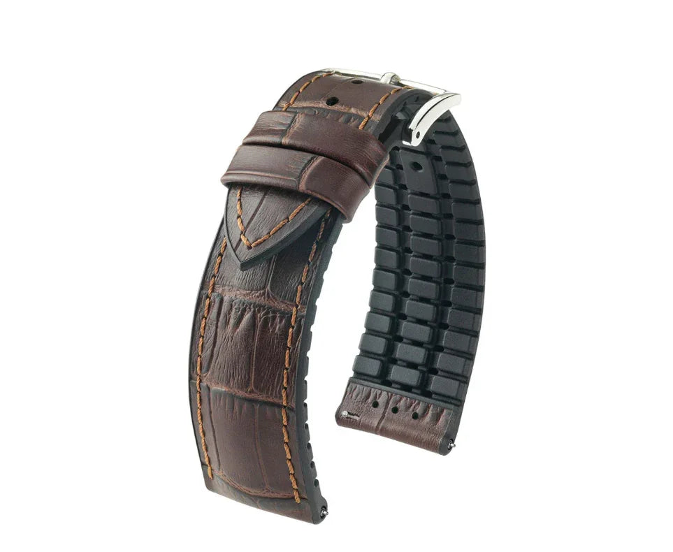 高級イタリアンカーフにナチュラルなアリゲーター柄を施した、落ち着いたセミマット仕上げのストラップです。