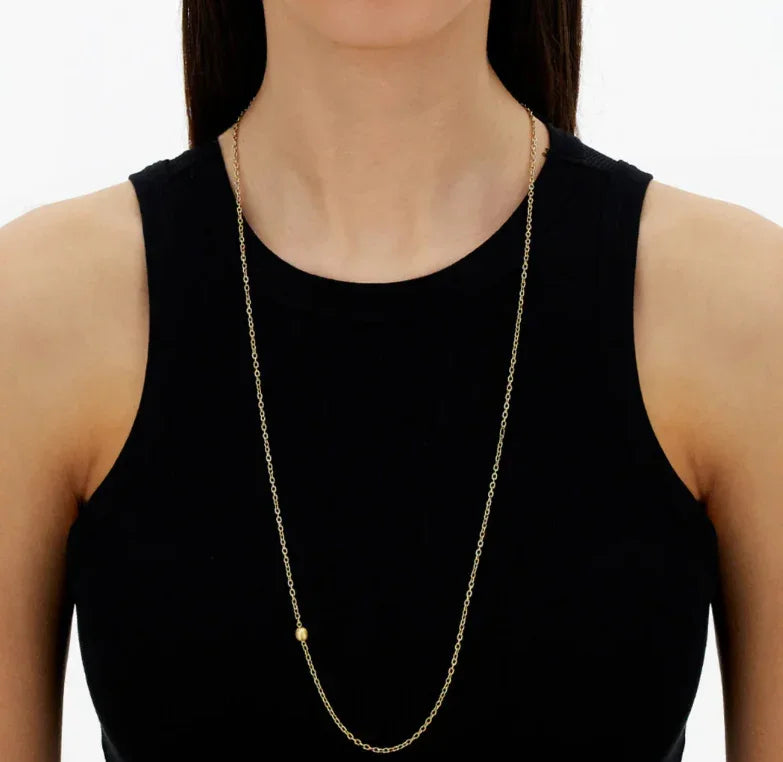 18Kゴールドのブールチェーンに、コレクションを象徴する手彫りのブールをあしらったネックレスです。長さを調節できる仕様により、2通りのバランスで着用でき、さまざまなネックラインや装いに自然に寄り添います。ミニマルで洗練されたデザインは、単体でも上品な存在感を放ち、チャームを組み合わせることで自分らしいアレンジも楽しめるのが魅力。日常にも特別なシーンにも取り入れやすい、自由度の高い一本です。