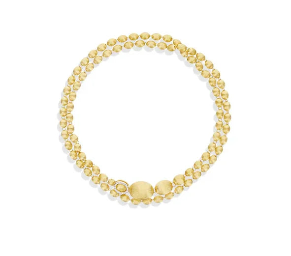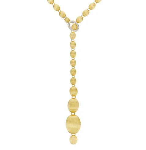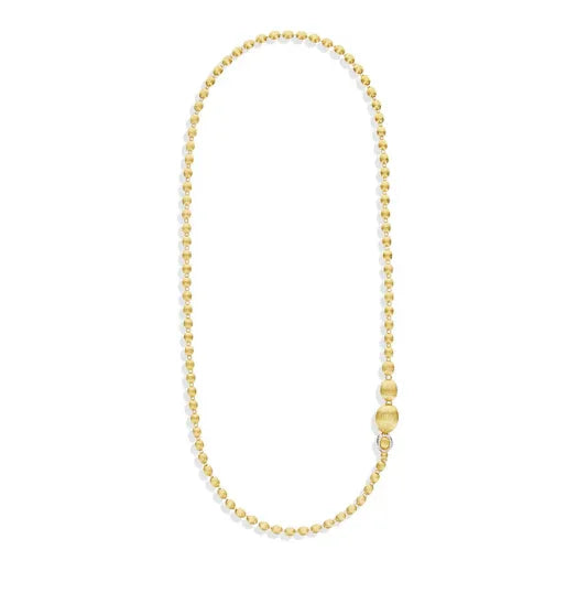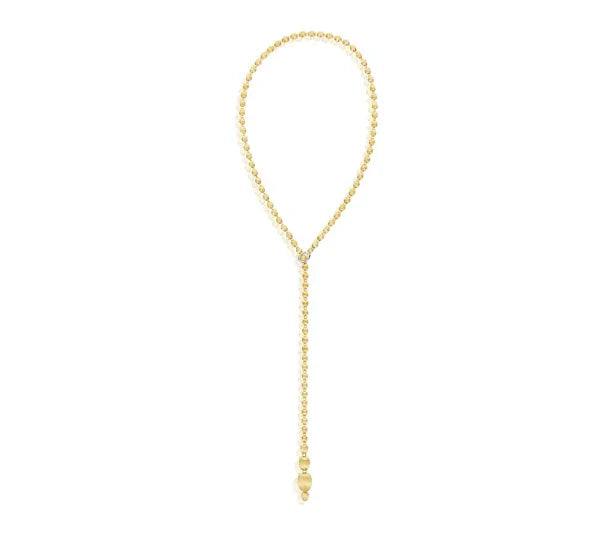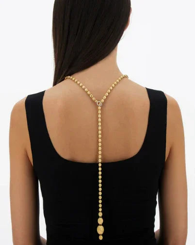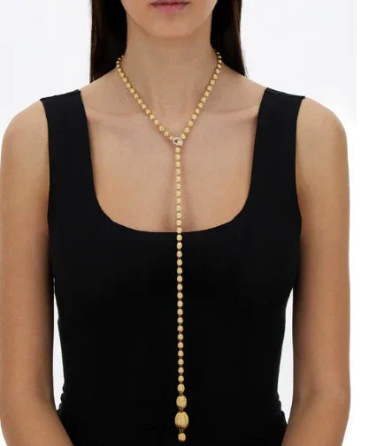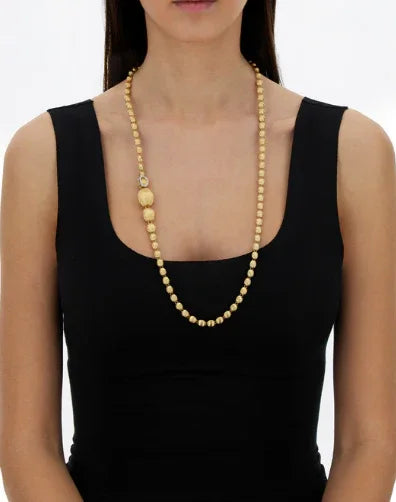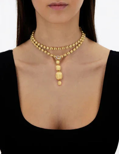 18Kイエローゴールドの手彫りブールを贅沢に連ねた、NANISらしい洗練を感じるネックレスです。ダイヤモンドをあしらったクラスプがアクセントとなり、ブールを包み込むように留めることで、多彩なアレンジを楽しめるデザインに仕上げられています。チョーカーのようにモダンに、クラシックなロングネックレスとして上品に、あるいはラリエットとして印象的に。装いや気分に合わせて表情を変えられる、自由度の高い一本です。約31インチのロングサイズならではの存在感も魅力です。