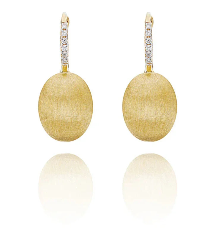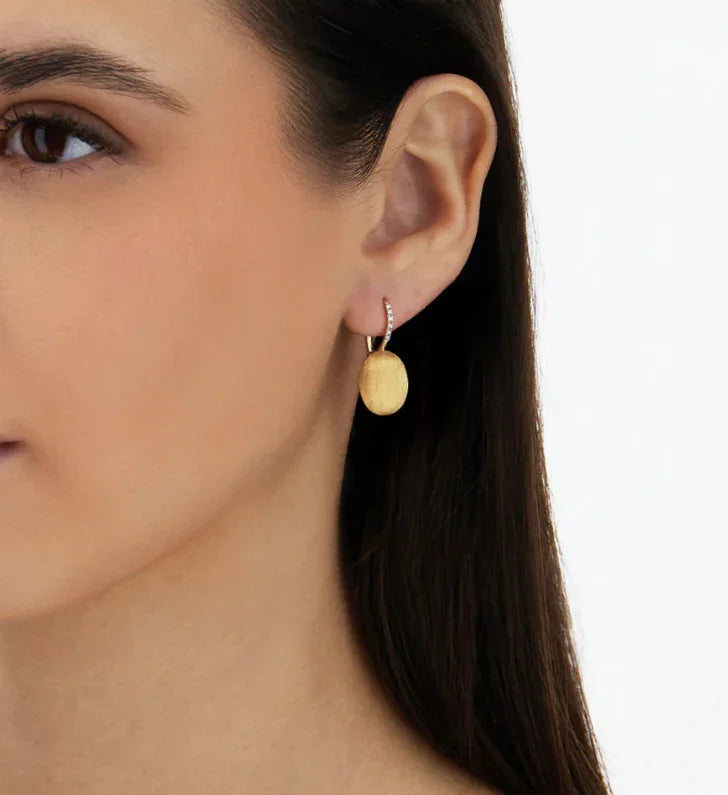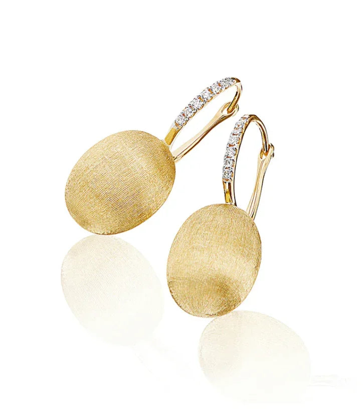エレガントなダイヤモンドのディテールが施された、18Kゴールドの洗練されたピアスです。 洗練された金細工が光と戯れて魅力的な反射を作り出し、自然と職人技の融合を果たします。