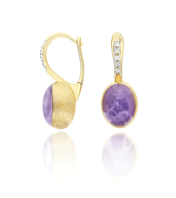 ナニスのアイコンである18Kゴールドのブール(球体)に、ロッククリスタル、レピドライト、マザーオブパールを重ねたトリプレットストーンが優雅に輝くピアス。