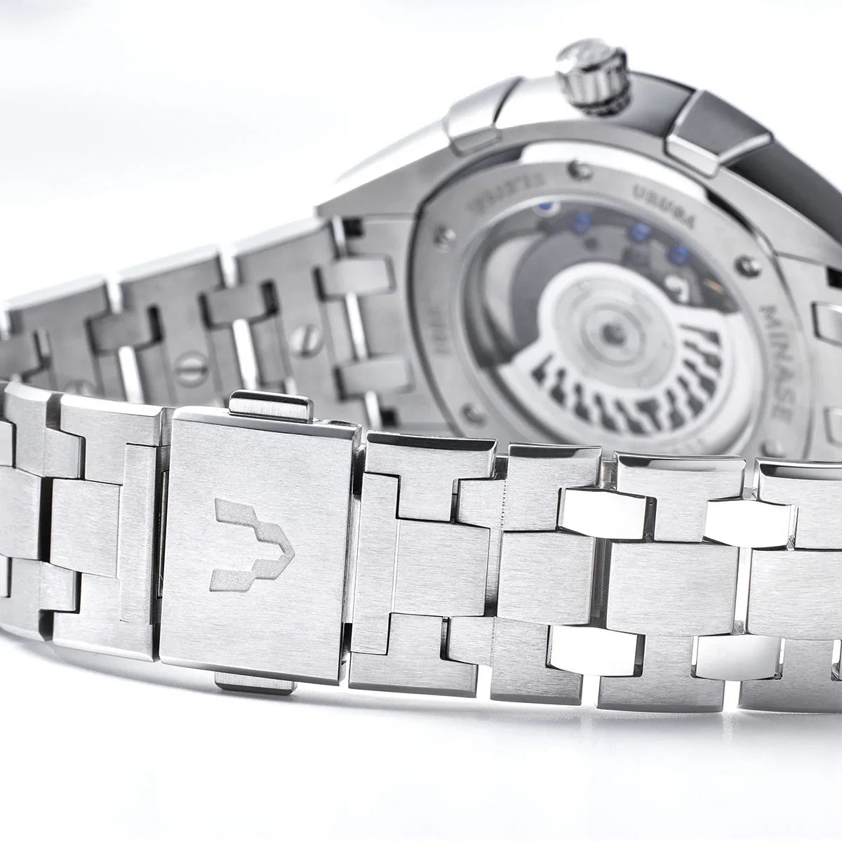 日本の誇る匠の技が結実した至高のタイムピース、Uruga 42ミントブルーの新作が誕生しました。ベゼル、ガラス、ケースを上下から4本の爪(クランピング構造)で挟み込む── まるでジュエリーのような洗練された造形。サファイアガラスとケースにはザラツ研磨を施し、光と陰が織り成すエッジの輝きとソフトな曲線が織りなす美しいコントラストを実現しました。